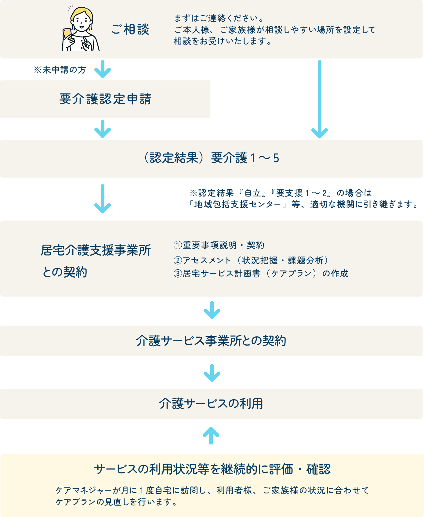 いま行っている介護や将来の介護についての悩み、不安などの相談をうけて生活へのアドバイスをしたり、介護サービスを利用するために、「要介護認定」の申請支援やケアプラン(居宅サービス計画)の作成をし、その後も継続的なフォローを行うなど、在宅生活への支援を行います。